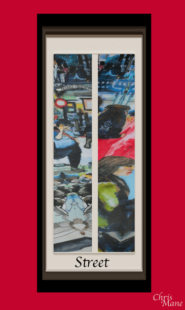 Street est né d’un premier geste à l’aquarelle, dont les traces vibrent encore sur la jambe, comme une mémoire du pinceau.